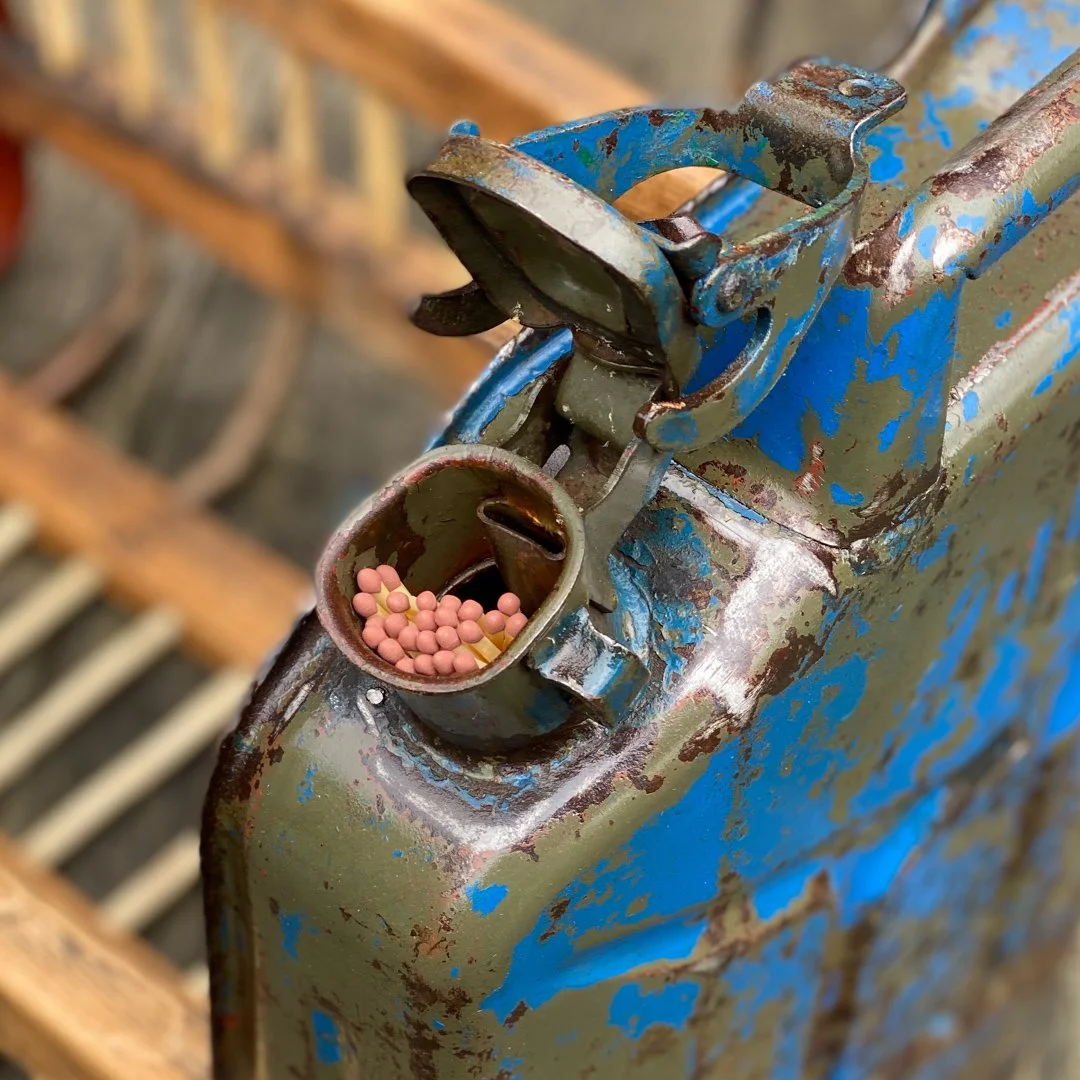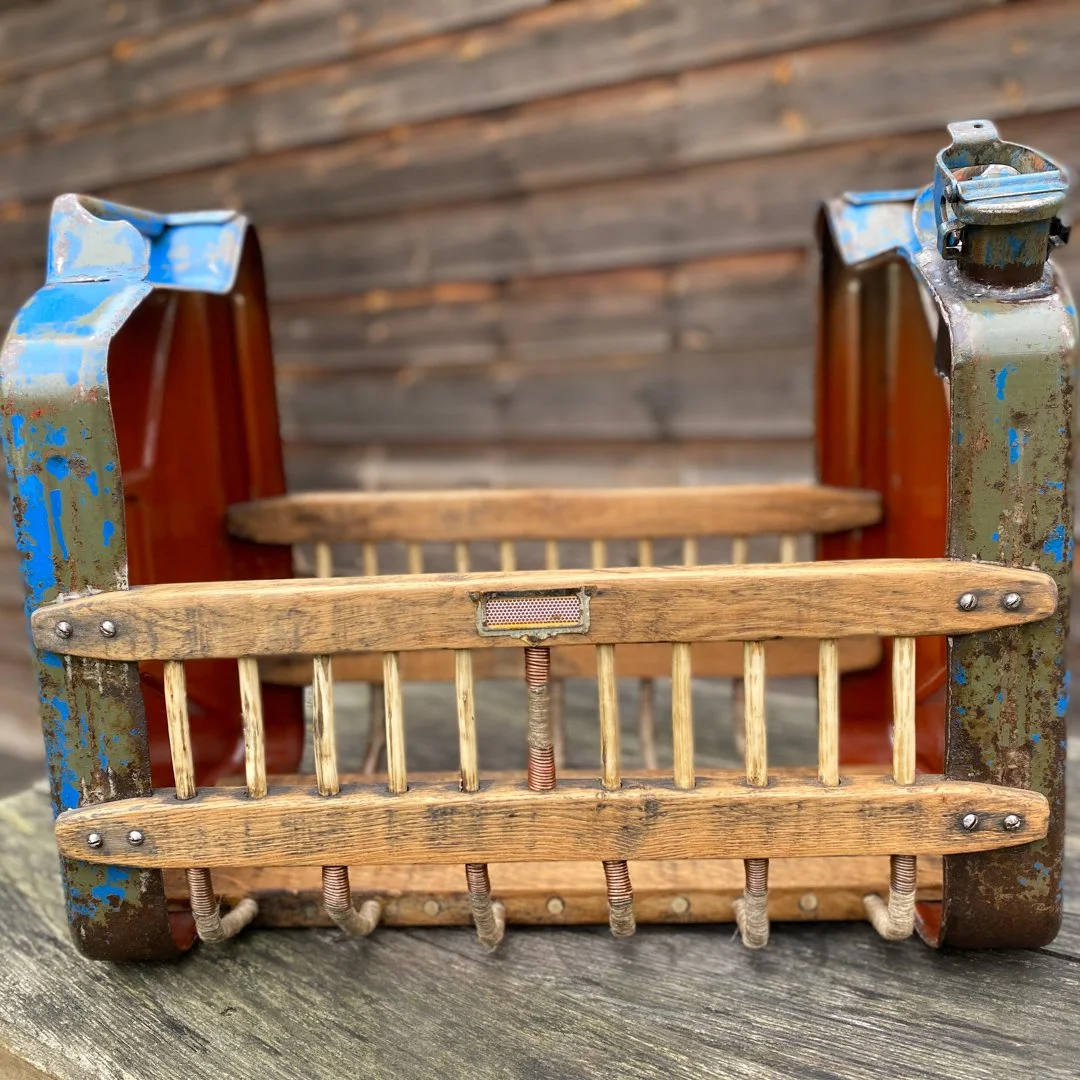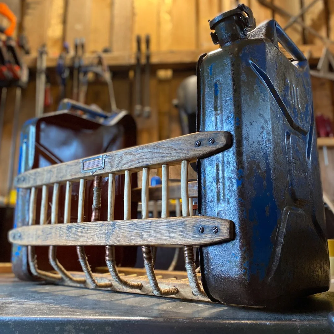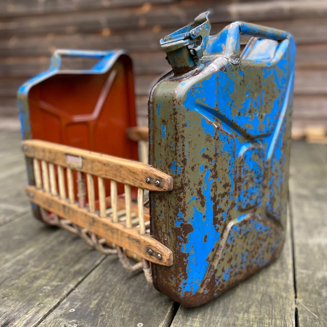Een oude jerrycan kreeg een verrassend nieuw doel als stijlvolle houtmand. Door staal en hout te combineren ontstond een stoer maar warm object dat perfect past bij elk haardvuur. In de oorspronkelijke vuldop verwerkte ik een handige houder voor lucifers — zo heb je alles bij de hand om een gezellig vuurtje aan te steken. Een functioneel ontwerp met karakter en een knipoog naar zijn industriële verleden.
